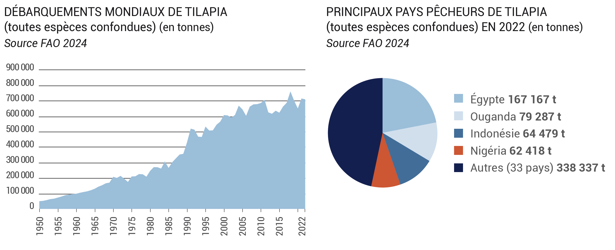 La production mondiale est actuellement largement dominée par le tilapia du Nil ; les premiers producteurs au niveau mondial sont la Chine et l’Indonésie. La production européenne de tilapia s’élève en moyenne à environ 385 tonnes par an (depuis 2010), mais une diminution significative de la production a été enregistrée en 2019, 2020 et 2021.