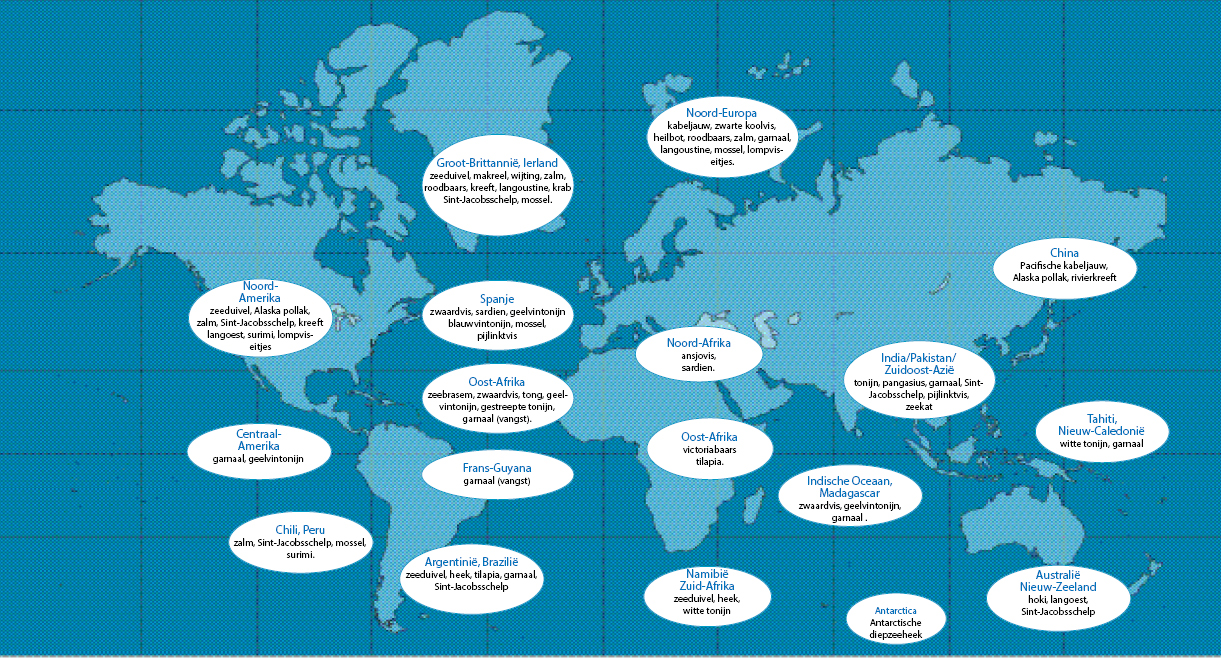 Productiegebieden van de vis en zeevruchten (wild en gekweekt) gegeten in België, Frankrijk en Zwitserland (klik op de kaart om uit te vergroten)