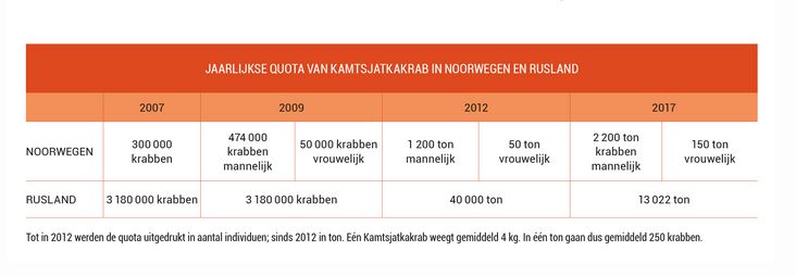 ➜ De koningskrab komt uit de Noordelijke Stille Oceaan, maar in de jaren zestig werd ze door Russische wetenschappers uitgezet in de Noord-Atlantische Oceaan.