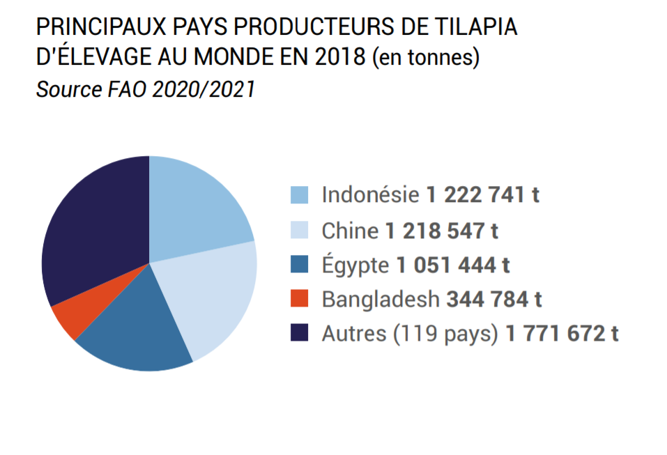 La production mondiale est actuellement largement dominée par le tilapia du Nil ; les premiers producteurs au niveau mondial sont la Chine et l’Indonésie. La production européenne de tilapia s’élève en moyenne à environ 385 tonnes par an (depuis 2010), mais une diminution significative de la production a été enregistrée en 2019, 2020 et 2021.